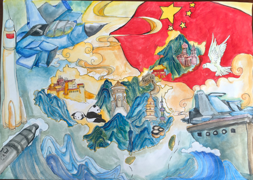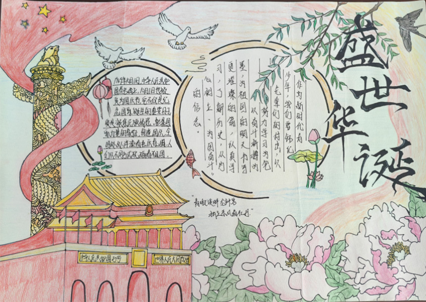 “笔绘山河”书画征集则汇聚了一幅幅原创佳作。书法作品笔力苍劲,书写“山河无恙,国泰民安”的祈愿;绘画作品色彩明快,勾勒长城、港珠澳大桥等壮丽图景;手抄报图文并茂,展现祖国发展的辉煌成就。