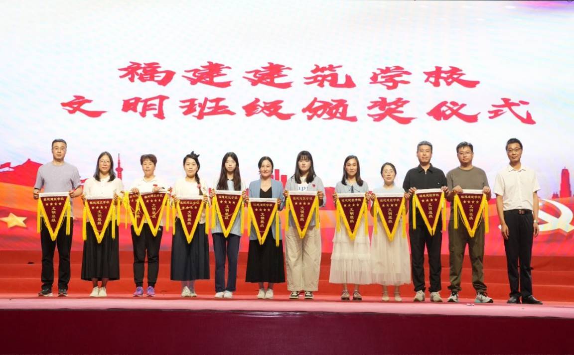 林国杰副校长、林修财副校长为获评三星级文明班级的班主任授旗并合影