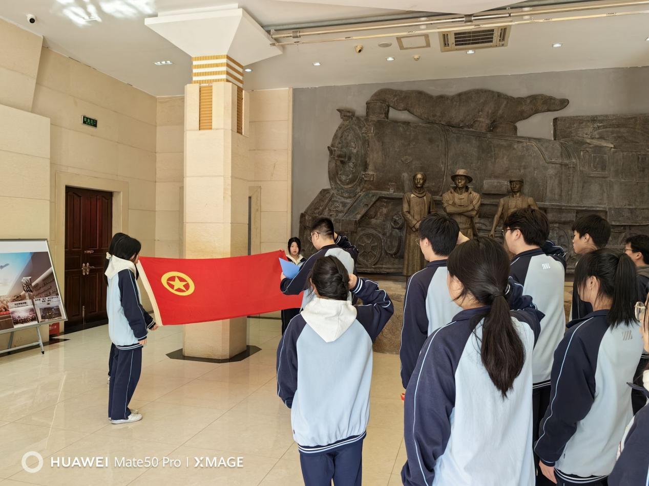 在团委副书记2327班马禹哲带领下,学生团员代表面对着鲜红的团旗,重温入团誓词,铿锵誓言在展厅回荡,红色血脉在年轻的胸膛激荡。