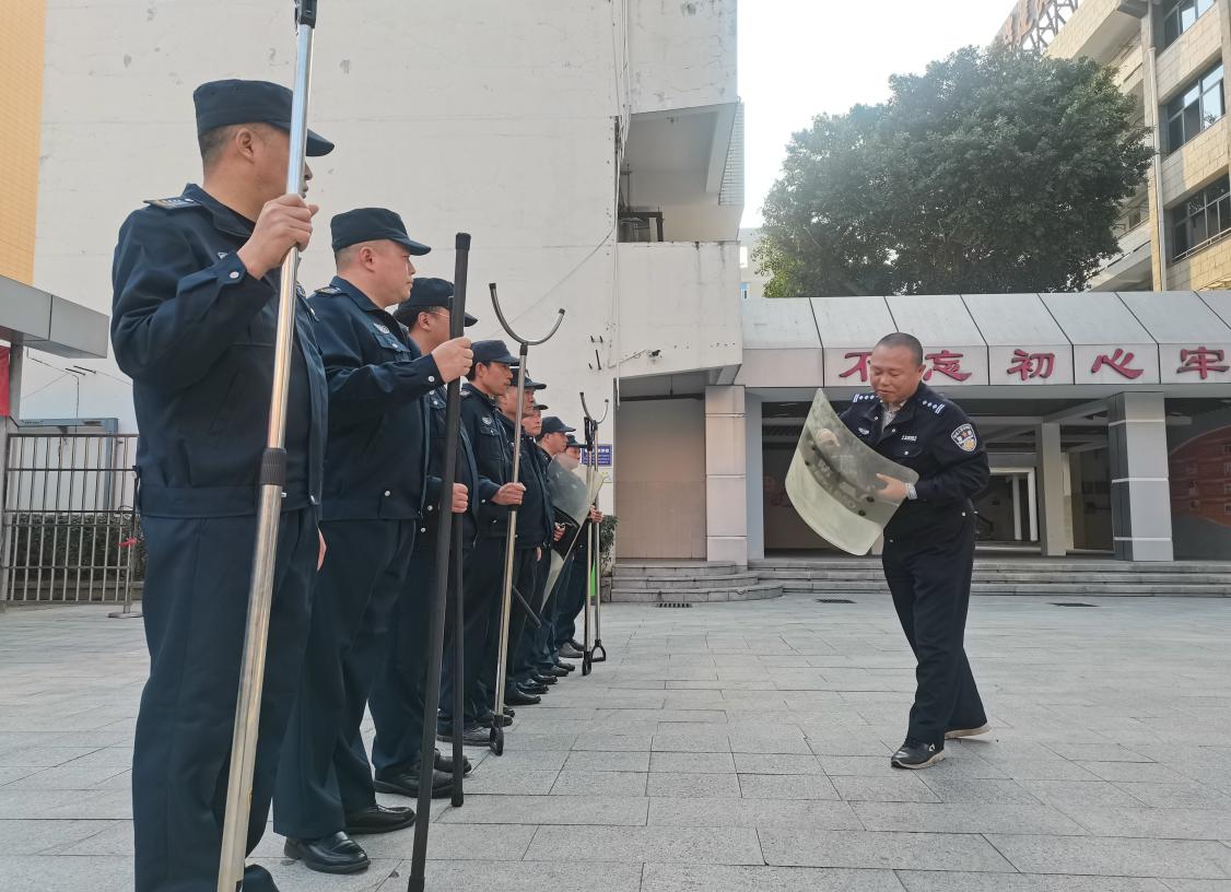 黄峰警官针对反恐实战技能为学校保安员开展了专业培训,详细讲解并演示了防暴盾、钢叉、警棍等专业防暴器械的正确使用方法,深入剖析了应急处突的流程与协作要点,确保每位参训人员都能深刻理解并掌握相关技能。
