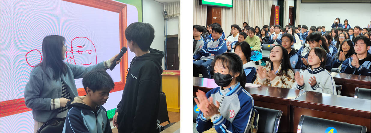 黄丽琴老师从有趣的“画人脸”活动入手,引导同学们在轻松愉快的氛围中探讨人际关系中自我与他人行为的差异感受。随后,通过生动有趣的“零食攻击”动画赏析,黄老师深入浅出地指导同学们从自我视角学会观察与明确表达,同时从他人立场学会感受、倾听与询问。她强调,面对困难与挑战时产生不良情绪、回避或自我否定是人之常情,关键在于学会接纳自我、相信希望、保持乐观,这样才能在人际关系中做到和而不同,实现健康交往。