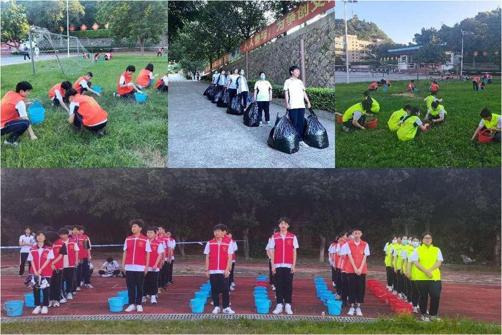 开展“环保护绿”行动。绿色劳动,美化环境。本学期通过招募环保志愿服务队,校内外点面结合推进“环保护绿”行动,组织8个班级354人次参加拔除杂草比赛,增强学生环保意识、文明意识、责任意识,争做文明环保的倡导者、参与者、宣传者。