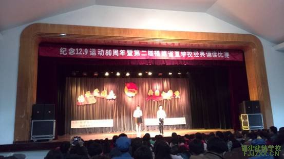 2015年11月29日在由福建省直属机关团工委,福建省教育厅直属机关团委联合主办的纪念12.9运动80周年暨第二届福建省直学校经典诵读比赛“传承爱国志共圆中国梦”活动中,我校1302班的林泽芃、陈心鸿两位同学,以稳定的发挥,良好的舞台表现力、精准的语言掌控能力以及出色的临场发挥,充分展现了我们建筑学子良好的精神风貌。