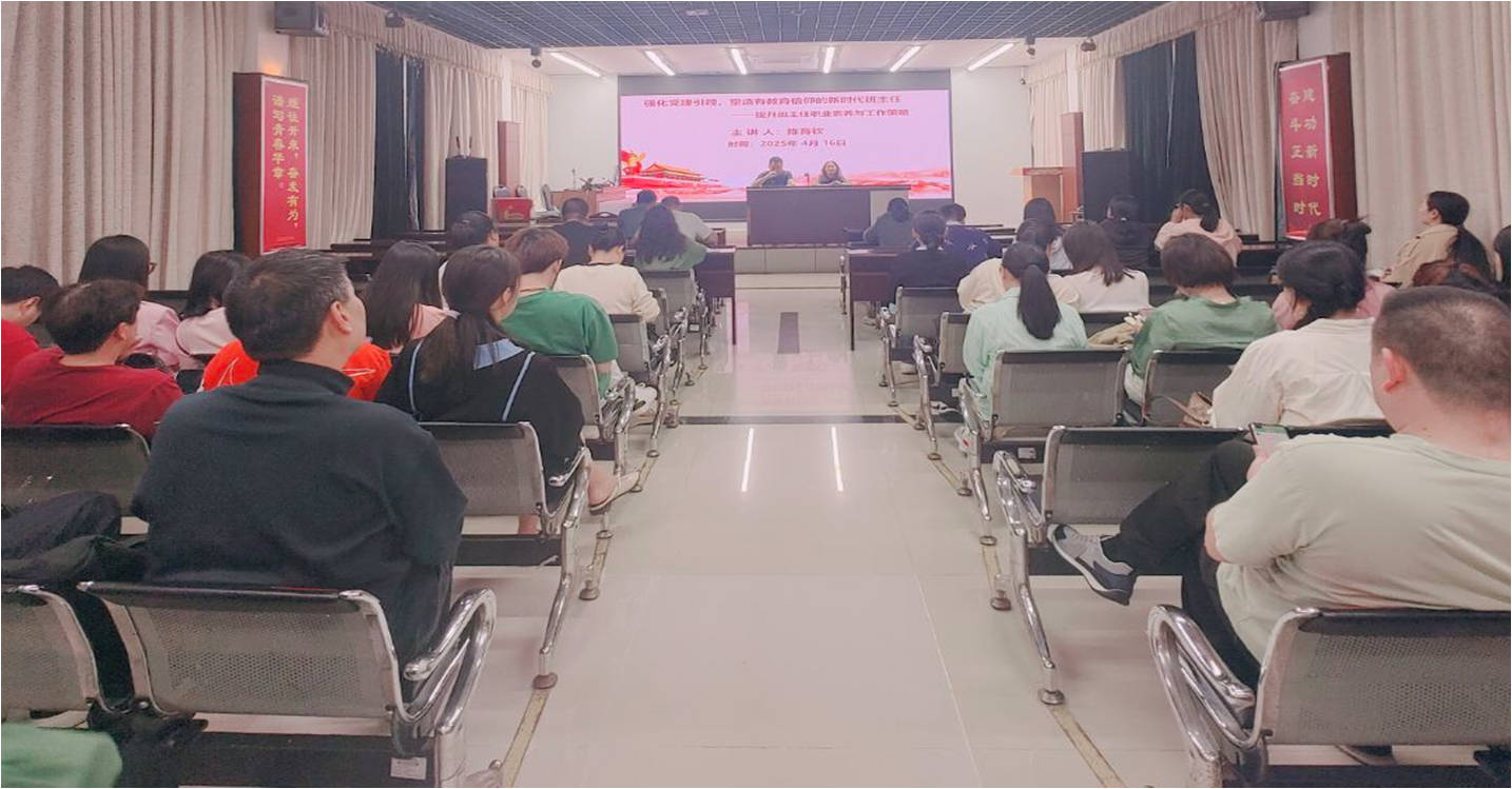 为切实解决班主任在班级管理中面临的实际问题,充分发挥党建引领作用,提升学校德育工作实效,积极构建“党建赋能、机制创新、协同育人”的三维联动体系,4月16日,我校第五党支部在校多功能厅开展“提升班主任职业素养”主题党日活动,以党建引领凝聚育人合力,共绘新时代德育工作蓝图。活动由支部党员黄扬钦主持,特邀教育专家陈育钦教授作专题分享,校党委委员、副校长林修财,第五党支部书记、学生科副科长李亚彬出席活动,支部全体党员与班主任共同参与。
