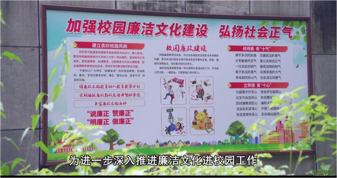 学校将廉洁教育活动纳入学校文化建设整体规划,通过廉洁主题班会、黑板报、校园文化长廊、观廉政教育基地、读廉洁故事、上廉政党课等寓教于乐活动,营造校园“崇廉”浓厚氛围,并将廉洁活动作为学校校园文化建设的一项常规工作抓实、抓细、抓出实效,营造和弘扬崇尚廉洁、抵制腐败的良好风尚。