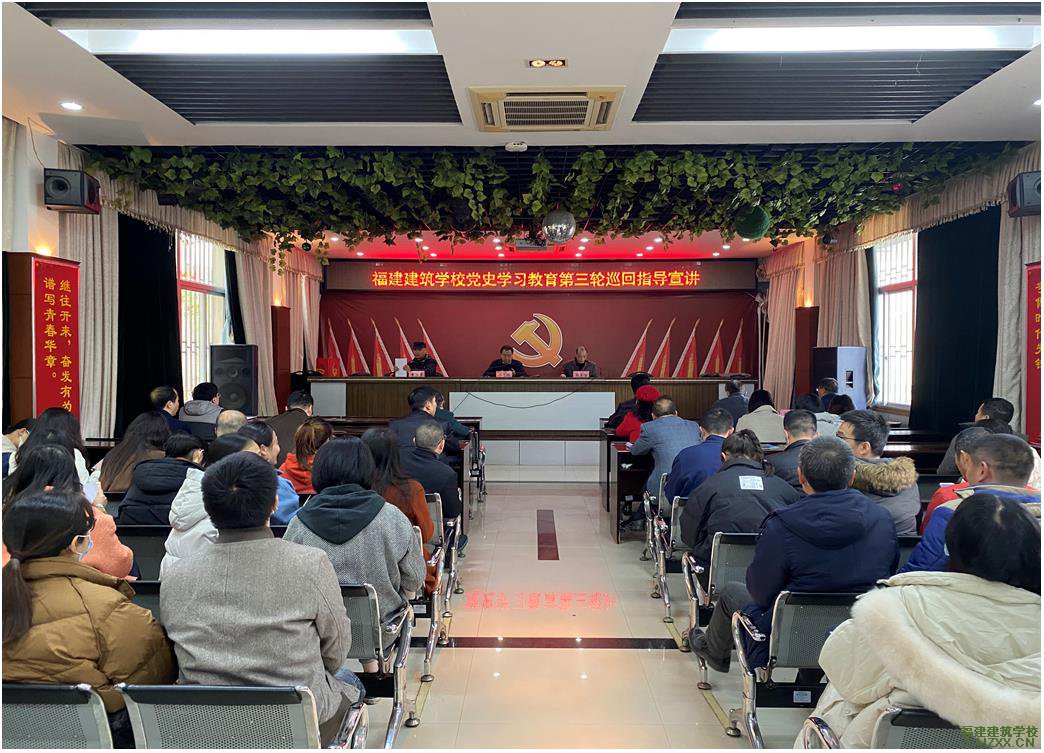 1月10日下午,福建省教育厅直属机关党史学习教育巡回指导组莅临我校开展党史学习教育第三轮巡回指导工作,在多功能厅召开会议宣讲党的十九届六中全会精神和省第十一次党代会精神,指导如何开好2021年度民主生活会工作,进行党史学习教育工作开展情况测评,学校党委班子全体成员及部分党员、群众参会。