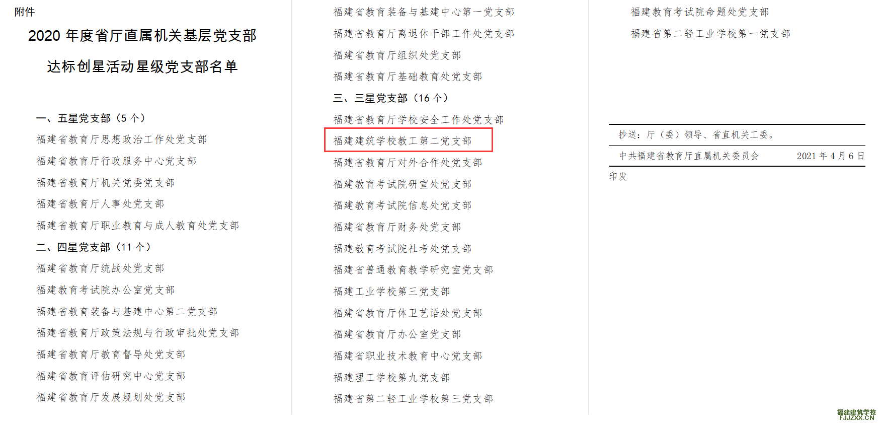 近日,福建省教育厅发布了《关于2020年度厅直属机关基层党支部达标创星评定结果的通报》,共计32个机关基层党支部被评为星级支部,我校教工第二党支部光荣上榜。